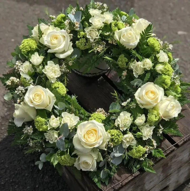 A beautiful and elegant funeral wreath with a combination of white and green flowers. The arrangement includes white roses, hydrangeas and delicate filler flowers complemented by lush greenery such as eucalyptus and soft foliage. The wreath's round design symbolizes eternity and remembrance, making it a meaningful tribute for funerals or memorial services.