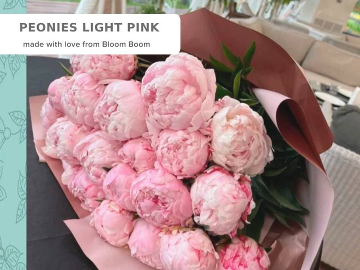 The bouquet of light pink peonies is a natural and effortless arrangement, wrapped beautifully in craft paper. This charming bouquet is available in four sizes, from small to extra-large, featuring 10, 15, 25, and 50 peonies, respectively. The soft pink hue of the peonies creates a delicate and elegant look, making this bouquet a perfect gift for many occasions. Each bloom is carefully selected to ensure the highest quality and freshness.